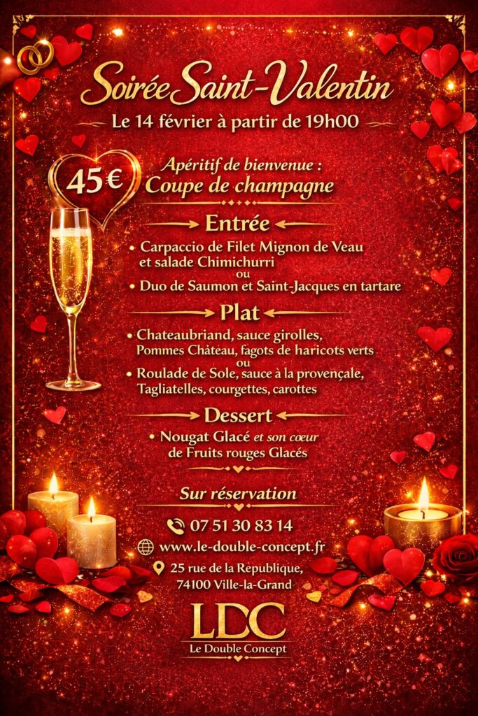 Le 14 février à partir de 19h00, venez célébrer l’amour autour d’un menu spécial Saint-Valentin dans une ambiance romantique et chaleureuse.